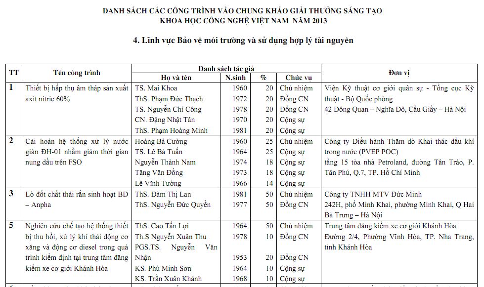 Theo kết quả đánh giá của Hội đồng giám khảo, Ban thư ký đã tổng hợp được 34 công trình đề nghị vào chung khảo.Xem chi tiết tại liên kết.